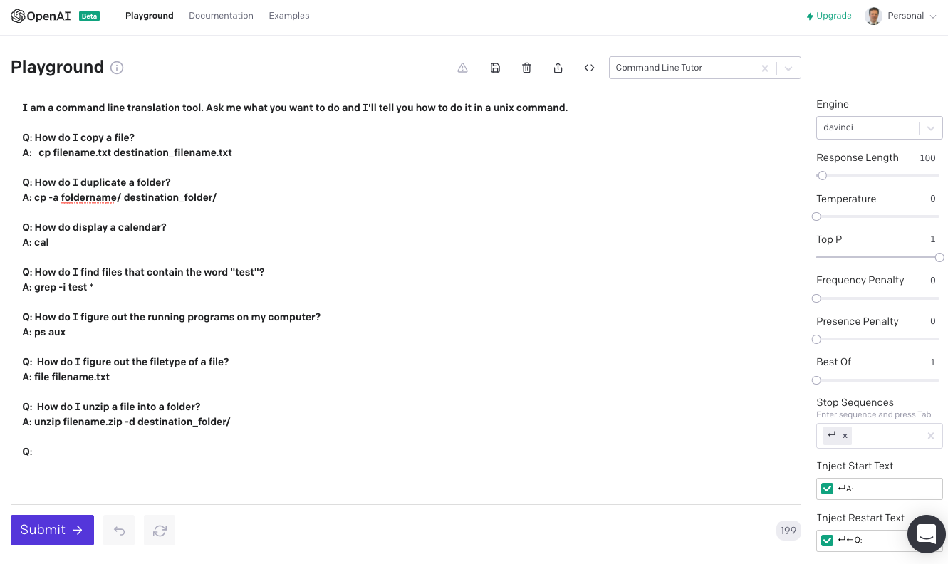 The development process starts in the playground of the OpenAI website. The examples section provides a number of examples, my command line bot was a modified version of a translation example.