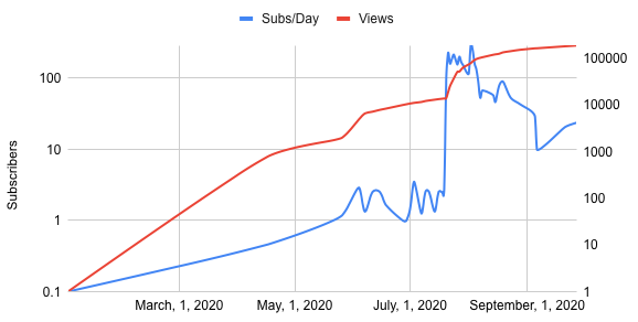 So after 8 months, I’m at 5000+ subscribers. Audience growth was very slow at first but it seems to be self-reinforcing. Apart from a traffic bump in July, from a more popular video, the subscriber/day growth appears to be logarithmic.