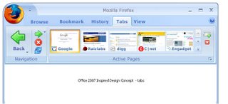 This type of design does bring up some interaction questions... Does it make sense to automatically bring the user to the 'Browse' tab when they create a new tab? Is it important to show the location area when using tabs? Is 'tabs' an appropriate name for what amounts to multiple open documents and not actually tabs? I'm sure this creates as many answers as questions but it does illustrate the gallery style and how the Office metaphor could be used within a browser for features beyond basic browsing.